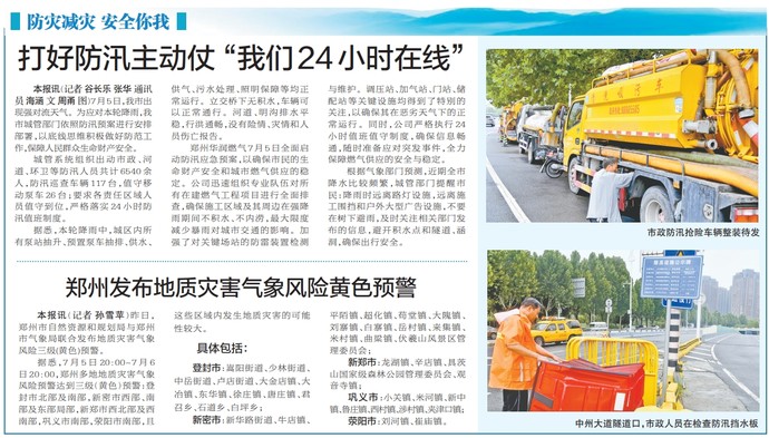 7月5日,我市出现强对流天气。为应对本轮降雨,我市城管部门依照防汛预案进行安排部署,以底线思维积极做好防范工作,保障人民群众生命财产安全。(今日《郑州日报》1版)