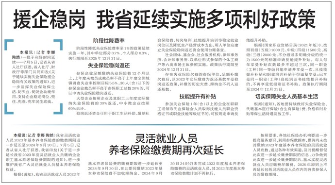 一揽子利好时间延续——7月5日,记者从省人社厅获悉,省人社厅、财政厅等部门共同印发《关于延续实施失业保险援企稳岗有关政策的通知》,进一步发挥失业保险保生活、防失业、促就业功能作用,支持企业稳定岗位,兜住、兜准、兜牢民生底线。(今日《郑州日报》2版)