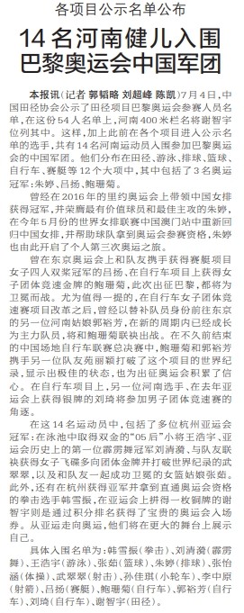 7月4日,中国田径协会公示了田径项目巴黎奥运会参赛人员名单,在这份54人名单上,河南400米栏名将谢智宇位列其中。这样,加上此前在各个项目进入公示名单的选手,共有14名河南运动员入围参加巴黎奥运会的中国军团。他们分布在田径、游泳、排球、篮球、自行车、赛艇等12个大项中,其中包括了3名奥运冠军:朱婷、吕扬、鲍珊菊。(今日《郑州日报》2版)