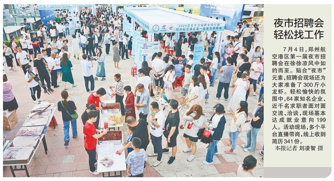 7月4日,郑州航空港区第一届夜市招聘会在徐徐凉风中如约而至。贴合“夜市”元素,招聘会现场还为大家准备了300斤小龙虾。轻松愉快的氛围中,64家知名企业、近千名求职者面对面交流、洽谈,现场基本达成就业意向199人。活动现场,多个平台直播带岗,线上收到简历341份。(今日《郑州日报》2版)