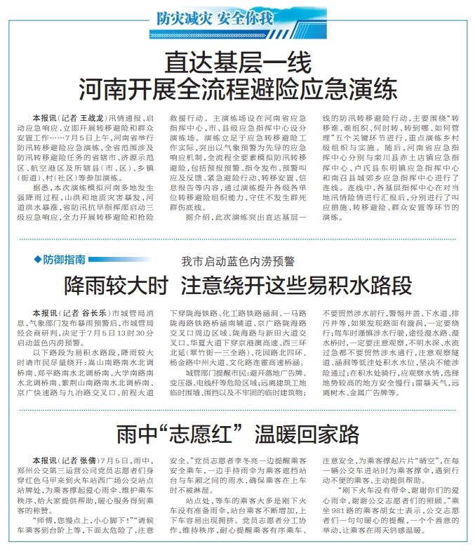 汛情通报、启动应急响应、立即开展转移避险和群众安置工作……7月5日上午,河南省举行防汛转移避险应急演练,全省范围涉及防汛转移避险任务的省辖市、济源示范区、航空港区及所辖县(市、区)、乡镇(街道)、村(社区)等参加演练。(今日《郑州日报》2版)