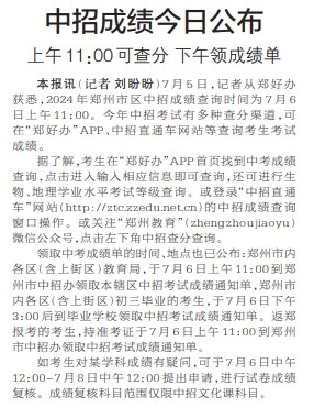 7月5日,记者从郑好办获悉,2024年郑州市区中招成绩查询时间为7月6日上午11:00。今年中招考试有多种查分渠道,可在“郑好办”APP、中招直通车网站等查询考生考试成绩。(今日《郑州日报》2版)