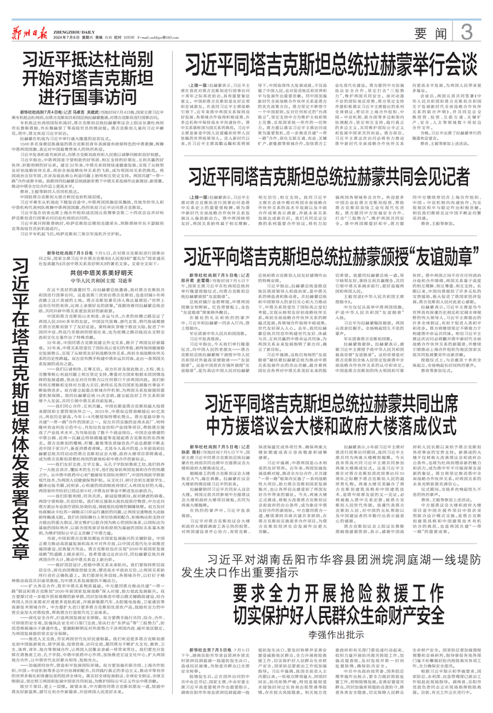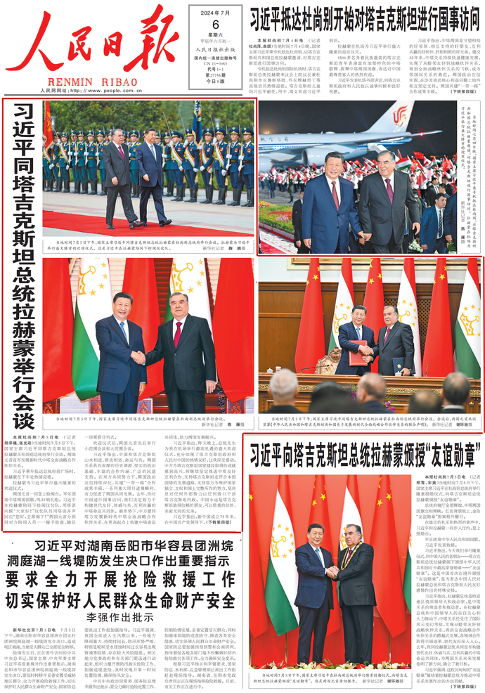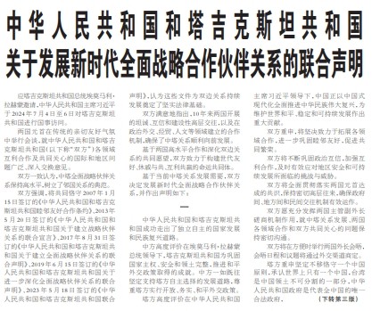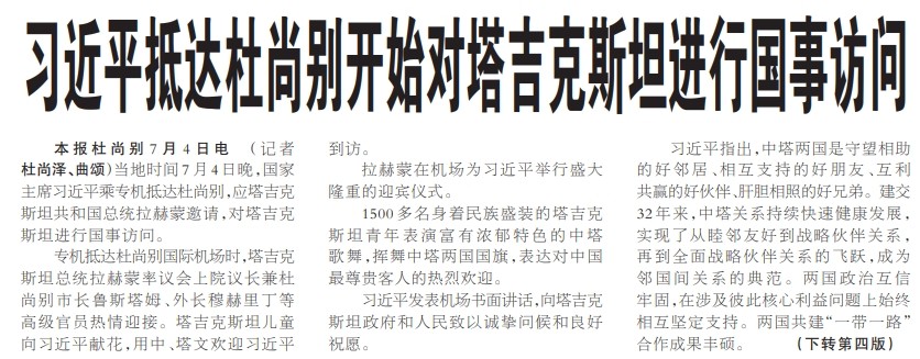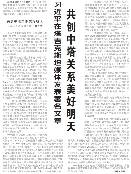 7月5日,在对塔吉克斯坦进行国事访问之际,国家主席习近平在塔吉克斯坦《人民报》和“霍瓦尔”国家通讯社发表题为《共创中塔关系美好明天》的署名文章。(今日《人民日报》2版、4版)