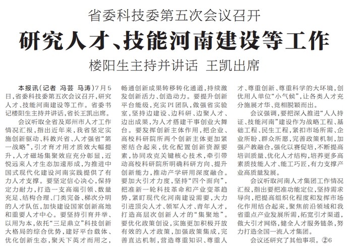7月5日,省委科技委第五次会议召开,研究人才、技能河南建设等工作。省委书记楼阳生主持并讲话,省长王凯出席。(今日《河南日报》1版)
