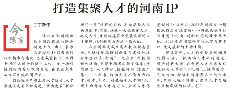 近日在郑州揭牌的中国现代农业联合研究生院,由11家涉农高校和13家农业科研机构参与建院,已完成首批300名博士、500名硕士的招生工作。又一场科技创新的美好双向奔赴,在农业大省与专家才俊之间开启。(今日《河南日报》1版)