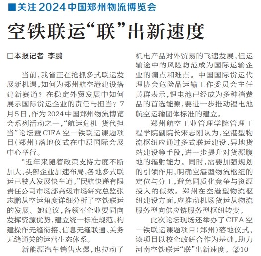 当前,我省正在抢抓多式联运发展新机遇,如何为郑州航空港建设搭建新赛道?在稳定外贸发展中如何展示国际货运企业的责任与担当?7月5日,作为2024中国郑州物流博览会系列活动之一,“航运危机 货代担当”论坛暨CIFA空—铁联运课题项目(郑州)落地仪式在中原国际会展中心举行。(今日《河南日报》3版)