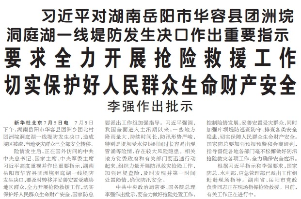 习近平对湖南岳阳市华容县团洲垸洞庭湖一线堤防发生决口作出重要指示