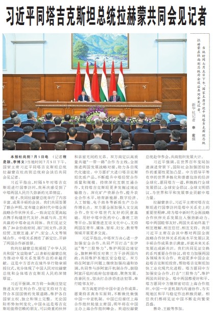 当地时间7月5日下午,国家主席习近平同塔吉克斯坦总统拉赫蒙在杜尚别总统府会谈后共同会见记者。(今日《人民日报》2版)