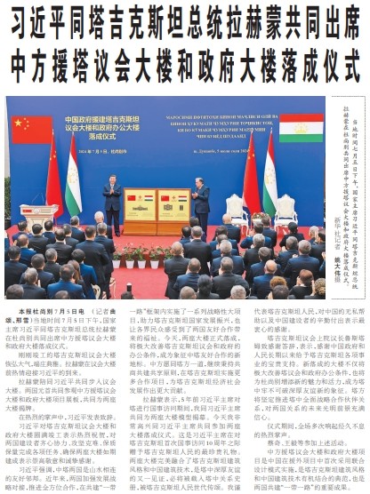 当地时间7月5日下午,国家主席习近平同塔吉克斯坦总统拉赫蒙在杜尚别共同出席中方援塔议会大楼和政府大楼落成仪式。(今日《人民日报》2版)