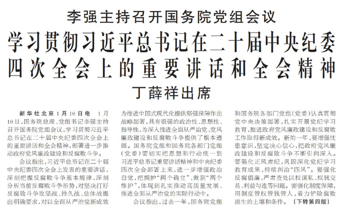 1月10日,国务院总理、党组书记李强主持召开国务院党组会议,学习贯彻习近平总书记在二十届中央纪委四次全会上的重要讲话和全会精神,部署进一步推动政府党风廉政建设和反腐败斗争。(今日《人民日报》1版、4版)