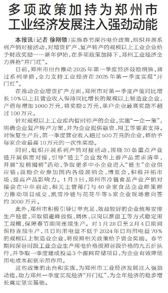 实施春节深谷电价政策,组织开展系列产销对接活动,对增资扩产、复产转产的规模以上工业企业给予财政奖励……新年伊始,在多项政策加持下,郑州工业经济全力拼抢“开门红”。(今日《郑州日报》1版)