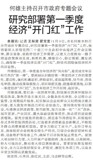 1月9日,市长何雄主持召开市政府专题会议,研究部署第一季度经济“开门红”工作,强调要深入贯彻党的二十届三中全会和中央经济工作会议精神,落实省委、省政府经济工作部署,以更大力度推动一揽子增量政策落地见效,抢抓机遇、提振信心,稳定预期、激发活力,确保第一季度经济实现“开门红”,持续巩固增强经济回升向好态势。(今日《郑州日报》1版)