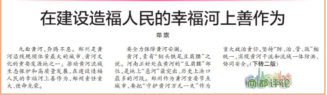 九曲黄河,奔腾不息。郑州是黄河沿线规模体量最大的城市、黄河文化的重要发源地之一。推动黄河流域生态保护和高质量发展,在建设造福人民的幸福河上善作为,郑州责任重大、使命光荣。(今日《郑州日报》1版、2版)
