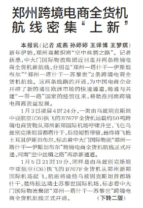 新年伊始,郑州高频织密“空中丝绸之路”。记者获悉,中大门国际物流集团近日连开两条跨境电商全货机新航线,分别是“郑州—塔什干—伊斯坦布尔”“郑州—塔什干—苏黎世”2条跨境电商全货机航线。这两条线路的开通,为中国电商企业开辟了新的通往欧洲市场的快速通道,畅通与共建“一带一路”国家的经贸往来,将助推河南跨境电商高质量发展。(今日《郑州日报》1版、2版)