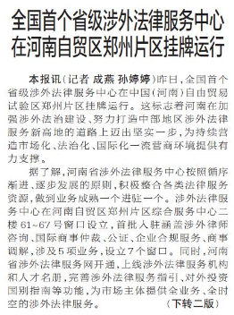 全国首个省级涉外法律服务中心在河南自贸区郑州片区挂牌运行