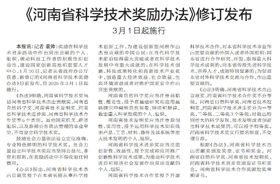 奖励在科学技术进步活动中作出突出贡献的个人、组织,调动科技工作者的积极性和创造性,建设国家创新高地和重要人才中心,1月10日,记者从省政府办公厅获悉,新修订的《河南省科学技术奖励办法》日前发布,自2025年3月1日起施行。(今日《郑州日报》2版)