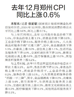 去年12月郑州CPI同比上涨0.6%