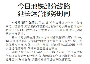 1月11日,郑州奥林匹克体育中心将举行大型活动,结合活动客流特点,地铁6号线开往清华附中方向、10号线开往郑州火车站方向延长运营服务时间,保障乘客出行需求。(今日《郑州日报》2版)