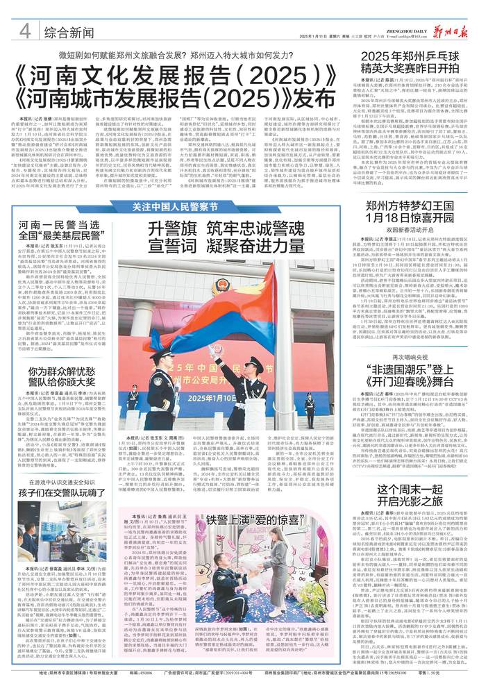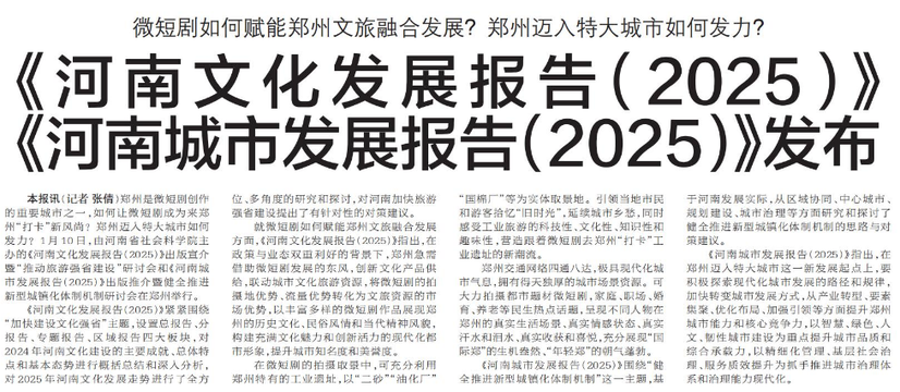 郑州是微短剧创作的重要城市之一,如何让微短剧成为来郑州“打卡”新风尚?郑州迈入特大城市如何发力?1月10日,由河南省社会科学院主办的《河南文化发展报告(2025)》出版宣介暨“推动旅游强省建设”研讨会和《河南城市发展报告(2025)》出版推介暨健全推进新型城镇化体制机制研讨会在郑州举行。(今日《郑州日报》4版)