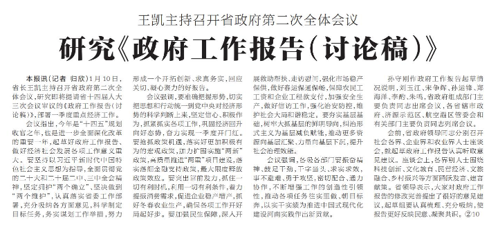 1月10日,省长王凯主持召开省政府第二次全体会议,研究即将提请省十四届人大三次会议审议的《政府工作报告(讨论稿)》,部署一季度重点经济工作。(今日《河南日报》1版)