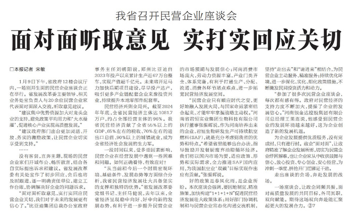 1月9日下午,省政府12楼会议厅内,一场别开生面的民营企业座谈会正在举行。省发展改革委主要领导、相关业务处室负责人与20余位民营企业家代表面对面深入交流,听取意见建议。(今日《河南日报》2版)