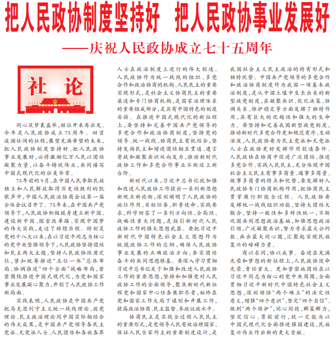 同心筑梦襄盛举,继往开来再出发。今年是人民政协成立75周年。回首波澜壮阔的征程,展望充满希望的未来,把人民政协制度坚持好、把人民政协事业发展好,必将激励亿万人民以团结凝聚力量,以奋斗铸就伟业,共同谱写中国式现代化的壮美华章。(今日《人民日报》1版)