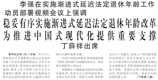 9月19日,国务院召开实施渐进式延迟法定退休年龄工作动员部署视频会议,中共中央政治局常委、国务院总理李强在会上强调,要深入学习贯彻习近平总书记重要指示精神,稳妥有序实施渐进式延迟法定退休年龄改革,为推进中国式现代化提供重要支撑。(今日《人民日报》1版、2版)
