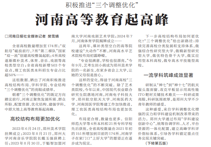 这组数据,晒出了河南积极推进高校结构布局、学科学院、专业结构“三个调整优化”的亮眼成绩单。(今日《河南日报》1版、5版)
