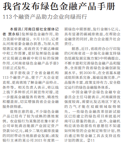 发挥绿色金融作用,助力美丽中原建设。9月13日,记者从河南省委金融办获悉,为深入贯彻落实省委、省政府关于碳达峰碳中和工作部署,更好发挥绿色金融对实现碳达峰碳中和目标的保障作用,《河南省绿色金融产品手册》日前正式发布。(今日《河南日报》2版)