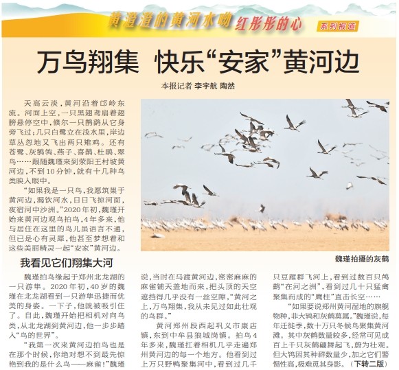 天高云淡,黄河沿着邙岭东流。河面上空,一只黑翅鸢扇着翅膀悬停空中,倏尔一只鹊鹞从它身旁飞过;几只白鹭立在浅水里,岸边草丛忽地又飞出两只雉鸡。还有苍鹭、灰鹡鸰、燕子、喜鹊、杜鹃、翠鸟……跟随魏瑾来到荥阳王村坡黄河边,不到10分钟,就有十几种鸟类映入眼中。(今日《郑州日报》1版、2版)