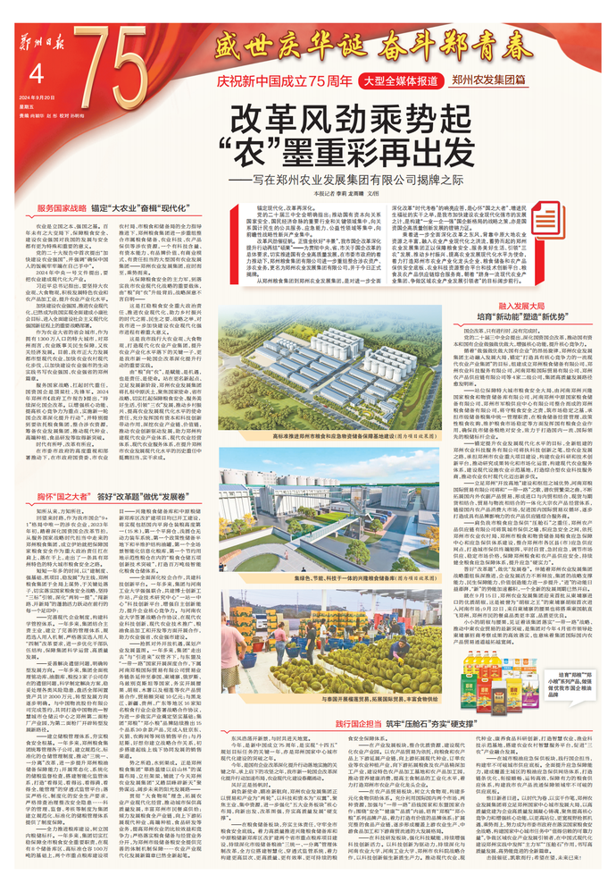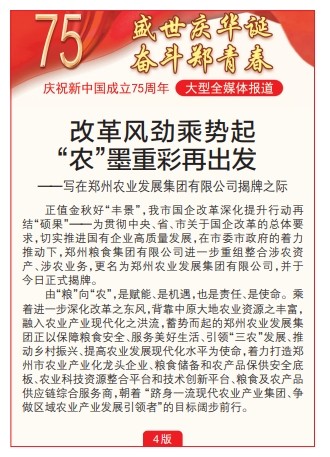 正值金秋好“丰景”,我市国企改革深化提升行动再结“硕果”——为贯彻中央、省、市关于国企改革的总体要求,切实推进国有企业高质量发展,在市委市政府的着力推动下,郑州粮食集团有限公司进一步重组整合涉农资产、涉农业务,更名为郑州农业发展集团有限公司,并于今日正式揭牌。(今日《郑州日报》1版、4版)