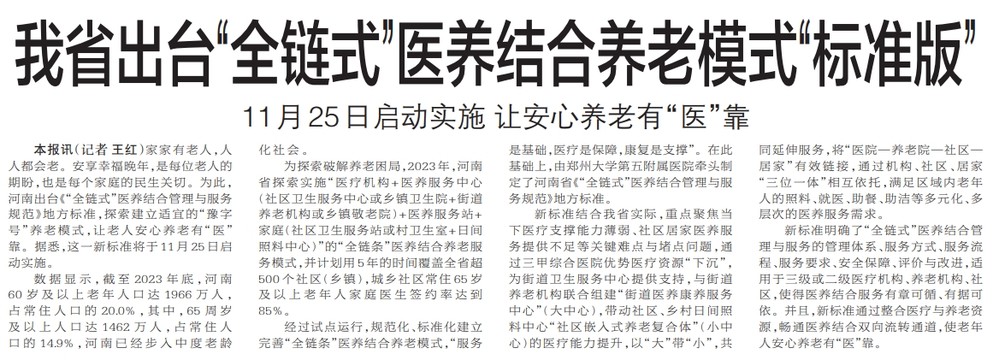 家家有老人,人人都会老。安享幸福晚年,是每位老人的期盼,也是每个家庭的民生关切。为此,河南出台《“全链式”医养结合管理与服务规范》地方标准,探索建立适宜的“豫字号”养老模式,让老人安心养老有“医”靠。据悉,这一新标准将于11月25日启动实施。(今日《郑州日报》5版)