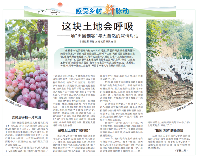 五年前,80后夫妻于冰和崔海晴卖掉省会郑州的房子,带着“让土地重新呼吸”的执念回乡创业,将于冰老家的一片荒山野岭变成了集种植、养殖、休闲于一体的生态农场,开始了一场人与自然的深情对话。(今日《郑州日报》1版、2版)