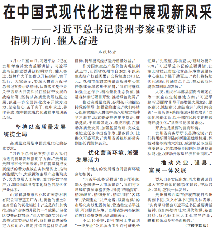 3月17日至18日,习近平总书记在贵州考察并发表重要讲话。习近平总书记的重要讲话指明方向、催人奋进,鼓舞广大干部群众开拓创新、实干笃行。大家表示,要深入贯彻习近平总书记重要讲话精神,认真落实党中央关于西部大开发和长江经济带发展的战略部署,坚持以高质量发展统揽全局,以进一步全面深化改革开放为动力,坚定信心、苦干实干,稳中求进、善作善成,在中国式现代化进程中展现新风采。(今日《人民日报》1版、4版)