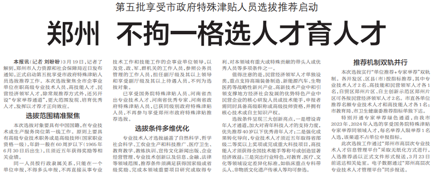 3月19日,记者了解到,郑州市人力资源和社会保障局近日发布通知,正式启动第五批享受市政府特殊津贴人员选拔推荐工作。本次选拔聚焦全市企事业单位在职高级专业技术人员、高技能人才、民营经济领军人才,除常规推荐方式外,还另开设“专家举荐通道”,更大范围发现、培育优秀人才,发挥以才荐才正向效应。(今日《郑州日报》2版)