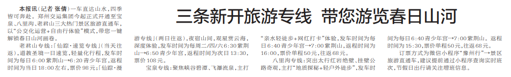 一车直达山水,四季皆可奔赴。郑州交运集团今起正式开通至宝泉、八里沟、老君山三大热门景区旅游直通车,以“公交化运营+自由行体验”模式,带您一键解锁春日山河画卷。(今日《郑州日报》2版)