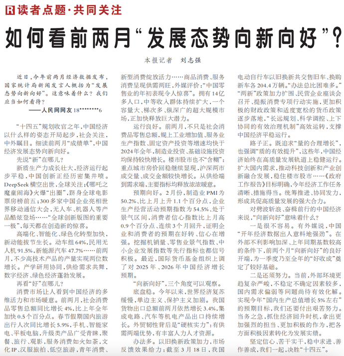 “十四五”规划收官之年,中国经济以什么样的姿态开局起步,社会关注,中外瞩目。细读前两月“成绩单”,中国经济发展态势向新向好。(今日《人民日报》1版)