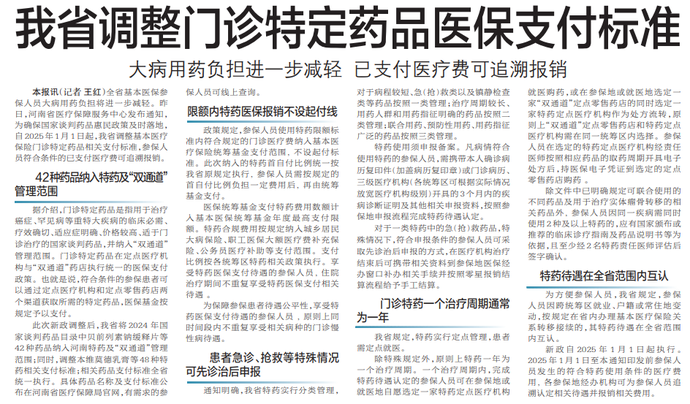 全省基本医保参保人员大病用药负担将进一步减轻。昨日,河南省医疗保障服务中心发布通知,为确保国家谈判药品惠民政策及时落地,自2025年1月1日起,我省调整基本医疗保险门诊特定药品相关支付标准,参保人员符合条件的已支付医疗费可追溯报销。(今日《郑州日报》5版)