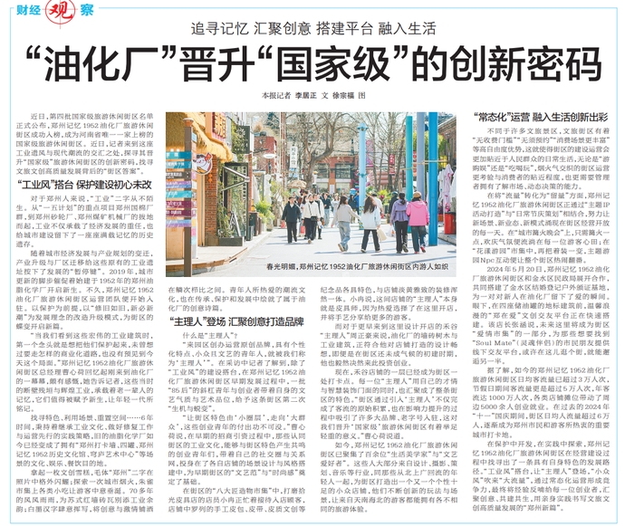 近日,第四批国家级旅游休闲街区名单正式公布,郑州记忆1952油化厂旅游休闲街区成功入榜,成为河南省唯一一家上榜的国家级旅游休闲街区。近日,记者来到这座工业遗风与现代潮流的交汇之处,探寻其晋升“国家级”旅游休闲街区的创新密码,找寻文旅文创高质量发展背后的“街区答案”。(今日《郑州日报》6版)