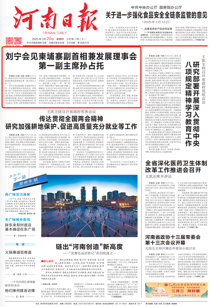 刘宁代表河南省委、省政府向孙占托一行来豫考察表示热烈欢迎。在简要介绍了河南经济社会发展有关情况后,刘宁说,习近平主席高度重视中柬关系发展,河南省坚决贯彻两国领导人就构建高质量、高水平、高标准的新时代中柬命运共同体达成的重要共识,双方在航空、经贸、文旅等领域开展务实合作,取得了积极进展和丰硕成果。当前,河南正聚焦建设全国统一大市场循环枢纽、打造国内国际市场双循环支点,深度融入共建“一带一路”和RCEP,创造性推动“海陆空数”丝绸之路建设,全方位扩大对内对外开放,深化与周边国家贸易协作,这将为推动双方合作提供新机遇。河南将深入贯彻落实两国领导人达成的系列重要共识,持续加强与柬埔寨各领域的友好交流和务实合作,深入推进中国—东盟自贸区3.0版全面实施,在互联互通上再拓展,在经贸合作上再加强,在人文交流上再深化,助力中柬“钻石六边”合作架构更加坚实,为续写中柬友谊、造福两地人民贡献更大力量。(今日《河南日报》1版)