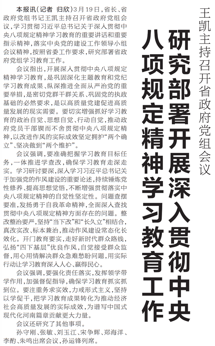 3月19日,省长、省政府党组书记王凯主持召开省政府党组会议,学习贯彻习近平总书记关于深入贯彻中央八项规定精神学习教育的重要讲话和重要指示精神,落实中央党的建设工作领导小组会议精神,按照省委工作要求,研究部署省政府党组学习教育工作。(今日《河南日报》1版)