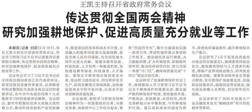 3月19日,省长王凯主持召开省政府常务会议,传达学习贯彻习近平总书记重要讲话重要指示精神,传达贯彻全国两会精神,研究加强耕地保护、促进高质量充分就业等工作。(今日《河南日报》1版)
