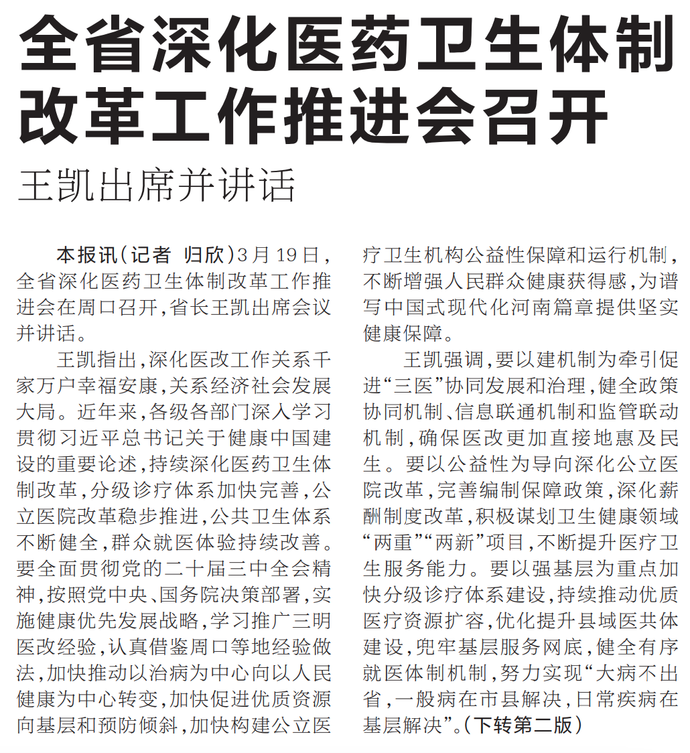 3月19日,全省深化医药卫生体制改革工作推进会在周口召开,省长王凯出席会议并讲话。(今日《河南日报》1版、2版)