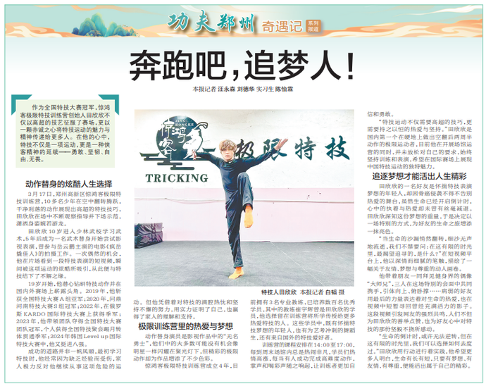 作为全国特技大赛冠军,惊鸿客极限特技训练营创始人田欣欣不仅以高超的技艺征服了赛场,更以一颗赤诚之心将特技运动的魅力与精神传递给更多人。在他的心中,特技不仅是一项运动,更是一种侠客精神的延续——勇敢、坚韧、自由、无畏。(今日《郑州日报》8版)