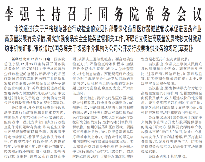 国务院总理李强12月23日主持召开国务院常务会议,审议通过《关于严格规范涉企行政检查的意见》,部署深化药品医疗器械监管改革促进医药产业高质量发展有关举措,研究加强食品安全全链条监管相关工作,听取建立促进高质量发展转移支付激励约束机制汇报,审议通过《国务院关于规范中介机构为公司公开发行股票提供服务的规定(草案)》。(今日《人民日报》1版)