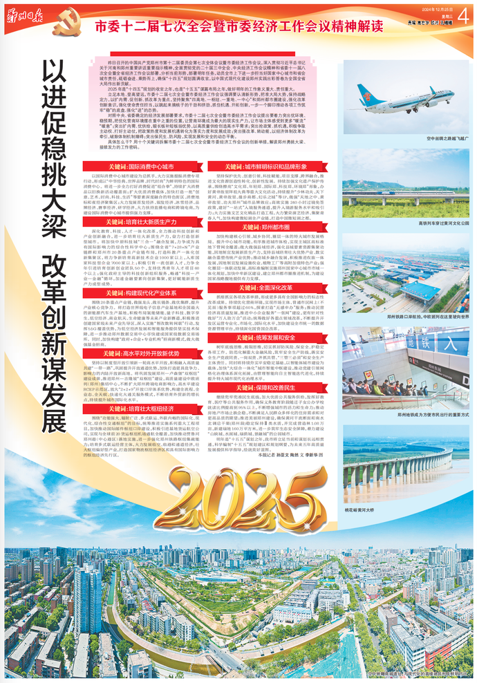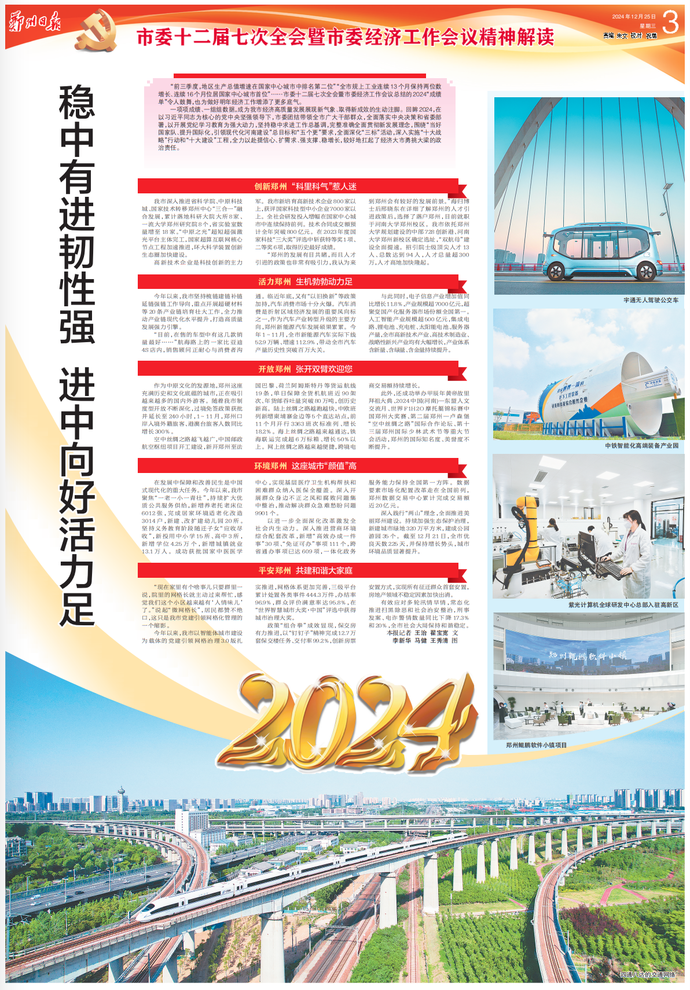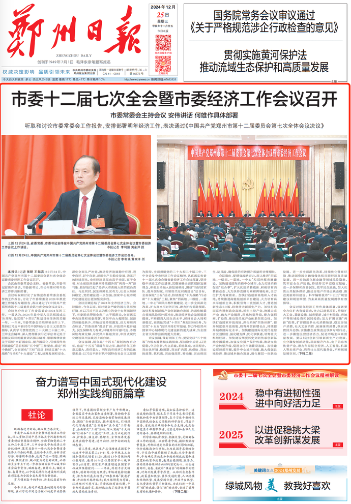 昨日召开的中国共产党郑州市第十二届委员会第七次全体会议暨市委经济工作会议,深入贯彻习近平总书记关于河南和郑州重要讲话重要指示精神,全面贯彻党的二十届三中全会、中央经济工作会议精神和省委十一届八次全会暨全省经济工作会议部署,分析当前形势,部署明年任务,动员全市上下进一步担当好国家中心城市和省会城市责任,砥砺奋进、乘势而上,确保“十四五”规划圆满收官,以中国式现代化建设郑州实践出彩答卷为全国全省大局作出新贡献。(今日《郑州日报》4版)