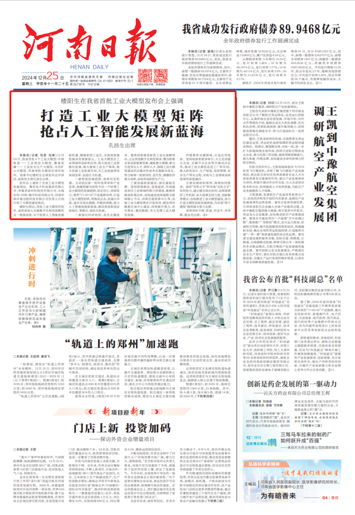 12月24日,我省首批4个工业大模型:中原智造——工业视觉大模型、豫鼎安澜——工业安全生产大模型、天信矿山大模型、华鼎雪豹大模型在郑州发布。省委书记楼阳生出席发布会并讲话,省政协主席孔昌生出席。(今日《河南日报》1版)