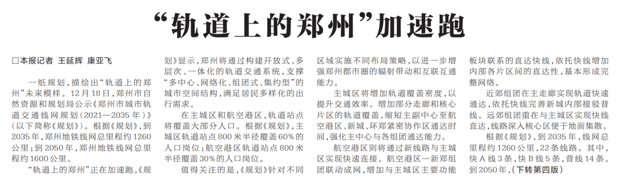一纸规划,描绘出“轨道上的郑州”未来模样。12月18日,郑州市自然资源和规划局公示《郑州市城市轨道交通线网规划(2021—2035年)》(以下简称《规划》)。根据《规划》,到2035年,郑州地铁线网总里程约1260公里;到2050年,郑州地铁线网总里程约1600公里。(今日《河南日报》1版)