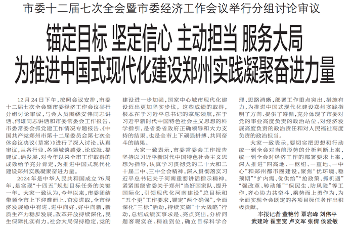 市委十二届七次全会暨市委经济工作会议,深入贯彻习近平总书记关于河南和郑州重要讲话重要指示精神,全面贯彻党的二十大和二十届二中、三中全会及中央经济工作会议精神,落实省委十一届八次全会暨省委经济工作会议部署,总结今年工作,分析当前形势,部署明年任务,达到了统一思想、明确方向、强化责任、凝心聚力的良好效果,必将动员全市上下进一步担当好国家中心城市和省会城市责任,砥砺奋进、乘势而上,锚定目标、奋勇争先,以中国式现代化建设郑州实践出彩答卷为全国全省大局作出新贡献。(今日《郑州日报》1版、2版)