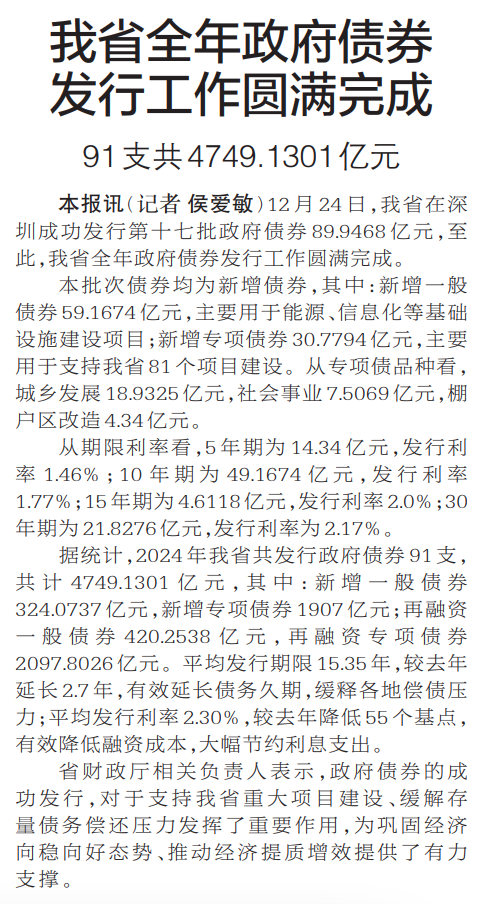 12月24日,我省在深圳成功发行第十七批政府债券89.9468亿元,至此,我省全年政府债券发行工作圆满完成。(今日《郑州日报》2版)